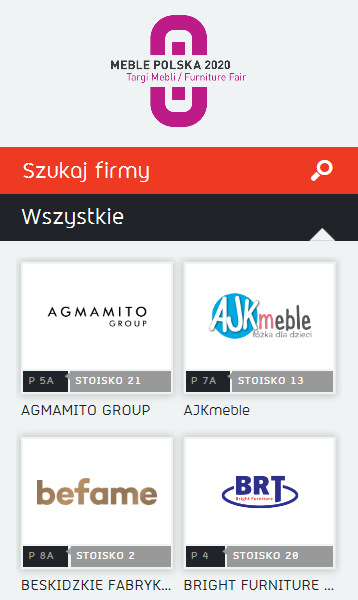 E-LOGO GOLD pod paskiem wyszukiwania – tylko 4 zablokowane miejsca na stale widoczne logotypy. Po kliknięciu na logo pojawia się podlinkowana mapka danego pawilonu z dokładnie zaznaczonym stoiskiem zamawiającego oraz informacje o firmie, galeria zamieszczonych zdjęć oraz filmów, logotyp, dane adresowe, przekierowanie na stronę www.